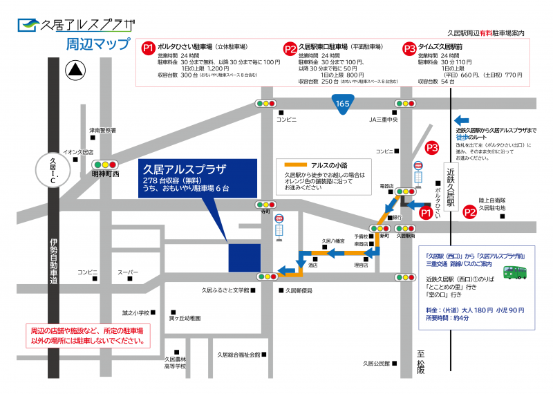 やむを得ずお車でお越しの場合には、事前に久居アルスプラザ周辺MAPをご確認いただきますようお願いいたします。